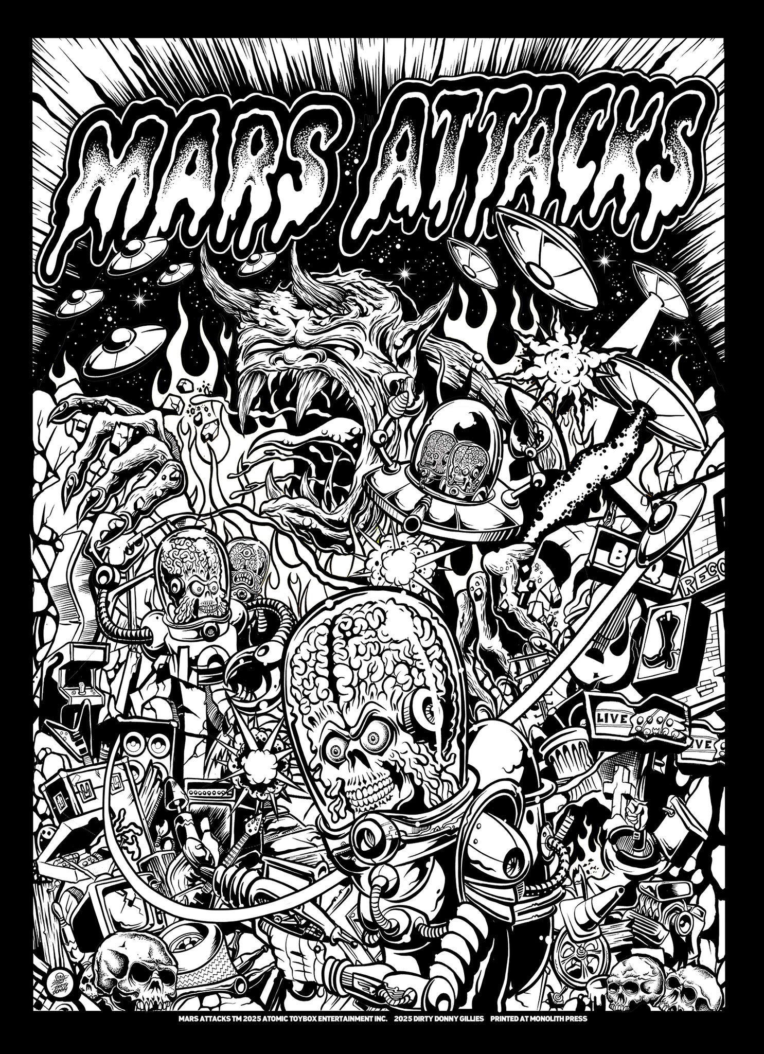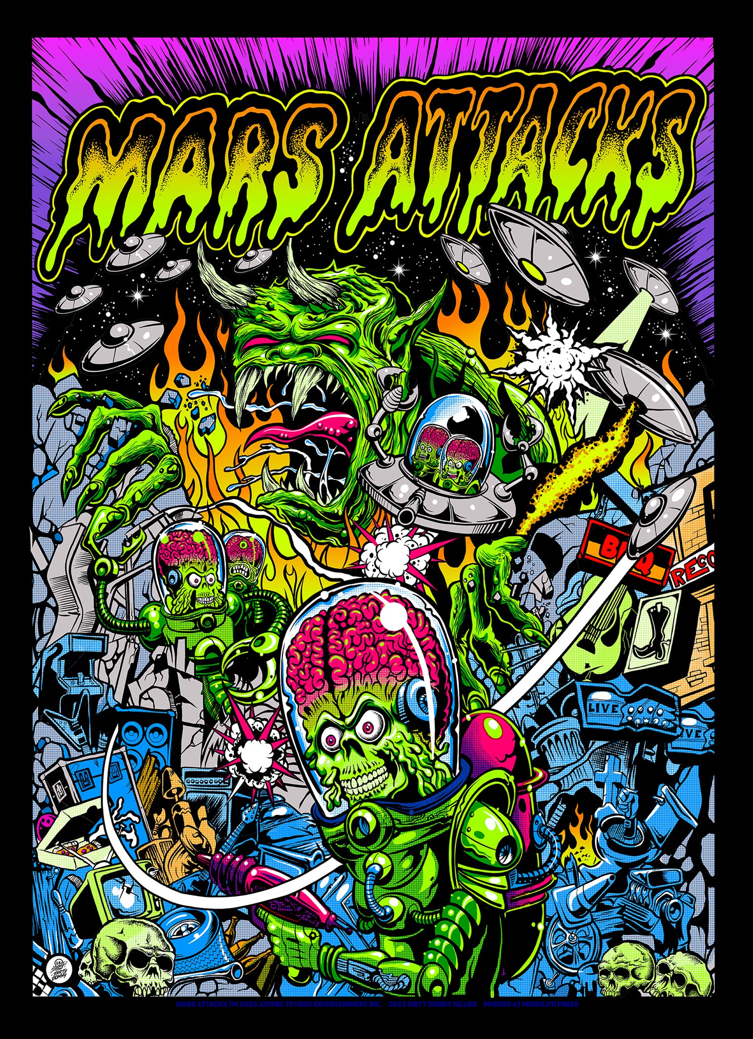 Mars Attacks Official artist prints! ONLY 100 are being printed with select variants as part of the 100 Limited Edition! Silk screen posters are Blacklight UV reactive (except the black and white version) 18x24 signed and numbered. Don't miss out on this rare DD Mars Attacks official art print!